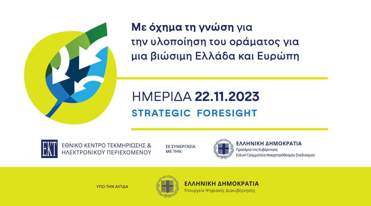 Hμερίδα με τίτλο «Με όχημα τη γνώση για την υλοποίηση του οράματος για μια βιώσιμη Ελλάδα και Ευρώπη – Μακροπρόθεσμος στρατηγικός σχεδιασμός και δεδομένα για δημόσιες πολιτικές και κοινωνικές προκλήσεις», διοργανώνει το Εθνικό Κέντρο Τεκμηρίωσης και Ηλεκτρονικού Περιεχομένου (ΕΚΤ) σε συνεργασία με την Ειδική Γραμματεία Μακροπρόθεσμου Σχεδιασμού της Προεδρίας της Κυβέρνησης, υπό την αιγίδα του Υπουργείου Ψηφιακής Διακυβέρνησης.