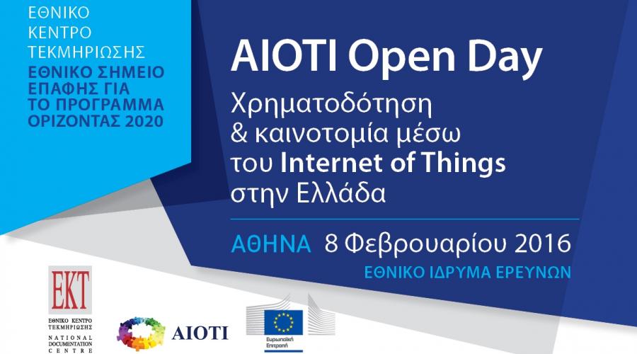 Το Εθνικό Κέντρο Τεκμηρίωσης, Εθνικό Σημείο Επαφής για το Πρόγραμμα Πλαίσιο "Ορίζοντας 2020" (Horizon 2020) της ΕΕ, και η ευρωπαϊκή Συμμαχία για το Διαδίκτυο των πραγμάτων (Alliance for the Internet of Things Innovation, AIOTI) διοργανώνουν εκδήλωση αναφορικά με τη διεύρυνση της εθνικής συμμετοχής σε μία από τις σημαντικότερες μελλοντικές τεχνολογίες, τo Internet of Things (IoT). Η εκδήλωση "AIOTI Open Day: Χρηματοδότηση & καινοτομία μέσω του Internet of Things στην Ελλάδα" συνδιοργανώνεται με την υποστήριξη της Ευρωπαϊκής Επιτροπής. Η εκδήλωση θα πραγματοποιηθεί τη Δευτέρα 8 Φεβρουαρίου 2016 (14.00) στο Εθνικό Ίδρυμα Ερευνών (Αμφ. Λ. Ζέρβας, Βασ. Κωνσταντίνου 48, Αθήνα).