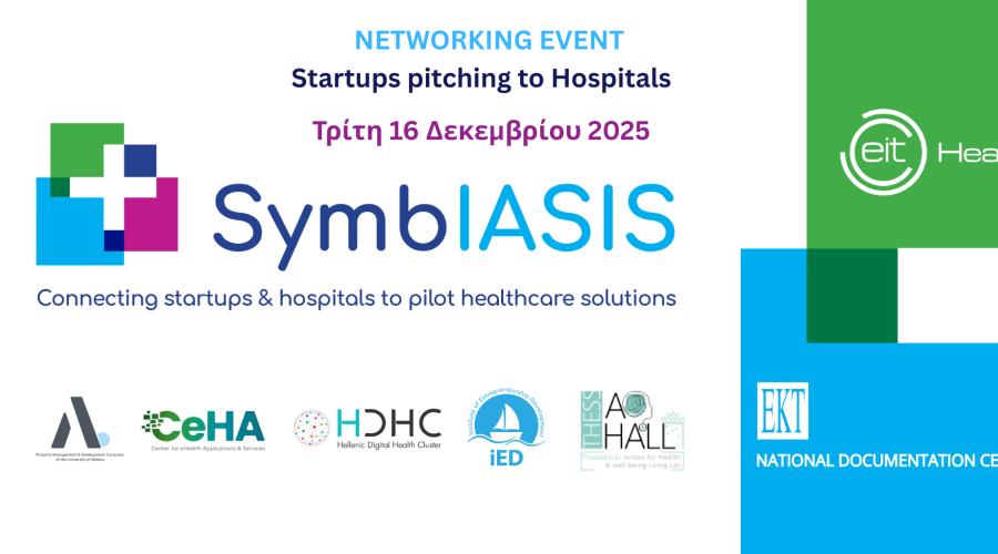 To Εθνικό Κέντρο Τεκμηρίωσης και Ηλεκτρονικού Περιεχομένου (ΕΚΤ), Εθνικός Εκπρόσωπος του EIT Health στην Ελλάδα και συντονιστής του προγράμματος SymbIASIS, διοργανώνει διαδικτυακή εκδήλωση δικτύωσης με τίτλο «Startups pitching to Hospitals» σε συνεργασία με την Εταιρεία Αξιοποίησης Περιουσίας του Εθνικού και Καποδιστριακού Πανεπιστημίου Αθηνών, το CeΗΑ (Center for e-Health Applications), το HDHC (Hellenic Digital Health Cluster), JOIST Innovation Park, την Τρίτη 16 Δεκεμβρίου 2025.