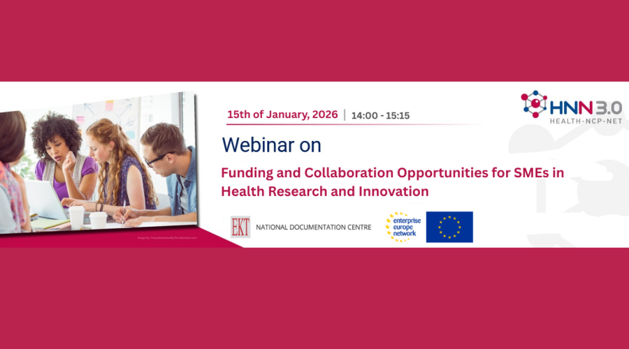 Το Εθνικό Κέντρο Τεκμηρίωσης & Ηλεκτρονικού Περιεχομένου (ΕΚΤ), βασικό μέλος του δικτύου των Εθνικών Σημείων Επαφής για την Υγεία στον Ορίζοντα Ευρώπη HNN3.0, Εθνικό Σημείο Επαφής για την Υγεία και την Αποστολή για τον Καρκίνο στον Ορίζοντα Ευρώπη και συντονιστής του Enterprise Europe Network Hellas, διοργανώνει διαδικτυακή εκδήλωση με τίτλο "Funding and Collaboration Opportunities for SMEs in Health Research and Innovation" την Τρίτη 15 Ιανουαρίου 2026 (ώρα Ελλάδας 14.00-15.15).