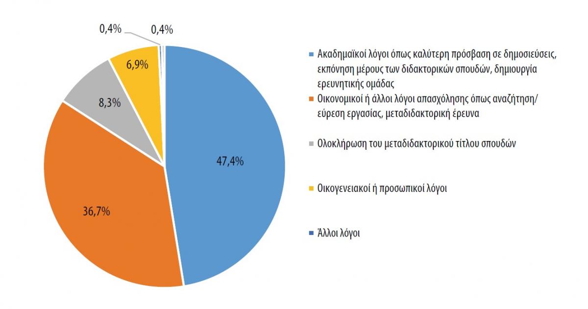 Οι βασικοί λόγοι κινητικότητας των Ελλήνων διδακτόρων σχετίζονται είτε με την ερευνητική τους δραστηριότητα (όπως εκπόνηση ή συνέχεια των διδακτορικών σπουδών, δημιουργία ερευνητικής ομάδας) σε ποσοστό 38,0%, είτε με την καριέρα τους (όπως αναζήτηση/εύρεση εργασίας, μεταδιδακτορική έρευνα) σε ποσοστό 28,1%.
