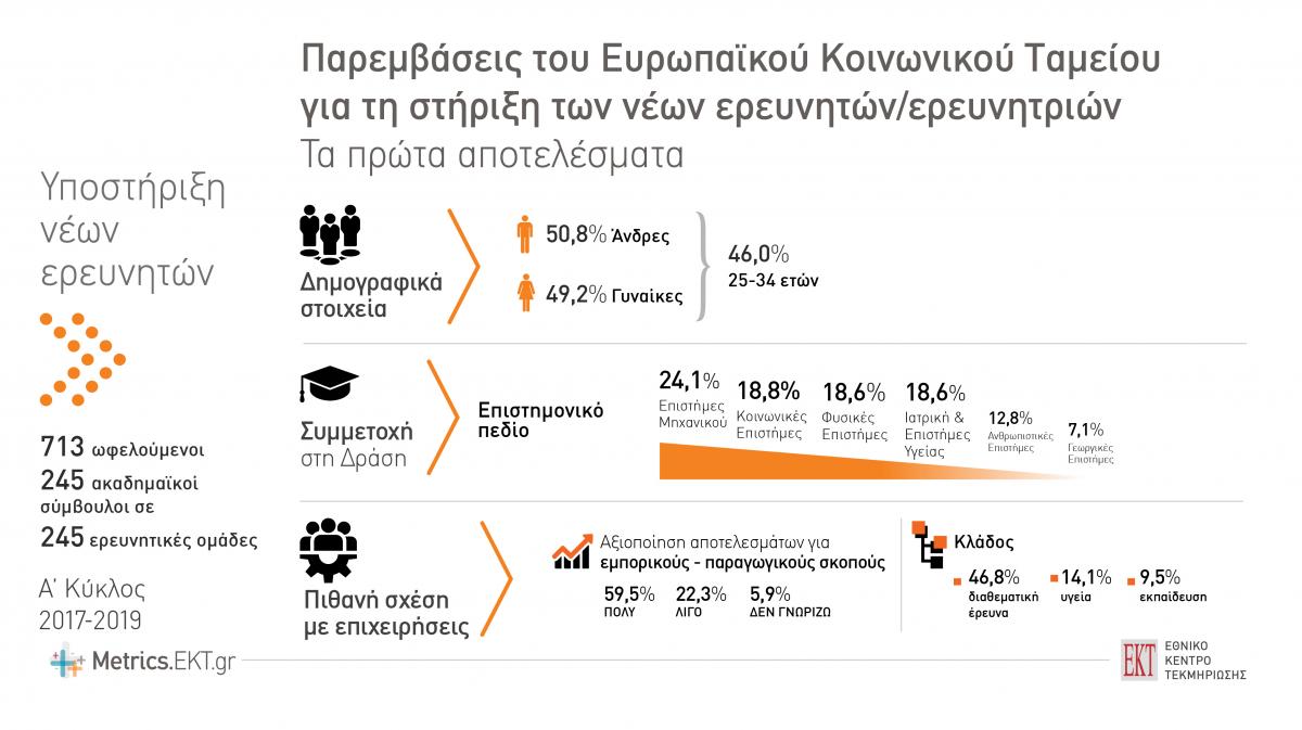 Στο πλαίσιο της Δράσης «Υποστήριξη ερευνητών με έμφαση στους νέους ερευνητές» (Α' Κύκλος 2017-2019) χρηματοδοτήθηκαν 713 νέοι ερευνητές και 245 ακαδημαϊκοί σύμβουλοι που διαμόρφωσαν 245 ερευνητικές ομάδες. Από αυτούς, το 32,2% δεν είχε παράλληλη απασχόληση κατά τη διάρκεια της Δράσης, το 49,2% ήταν γυναίκες και το 50,8% άνδρες, ενώ η πλειονότητα των νέων ερευνητών ήταν μεταξύ 25 και 34 ετών (46,0%). Το αντικείμενο της έρευνας εμπίπτει στον τομέα των Επιστημών Μηχανικού (24,1%), ενώ ακολουθούν οι Κοινωνικές Επιστήμες (18,8%), οι Φυσικές Επιστήμες και η Ιατρική και οι Επιστήμες Υγείας (αμφότερες με 18,6%), οι Ανθρωπιστικές Επιστήμες (12,8%) και οι Γεωργικές Επιστήμες (7,1%).