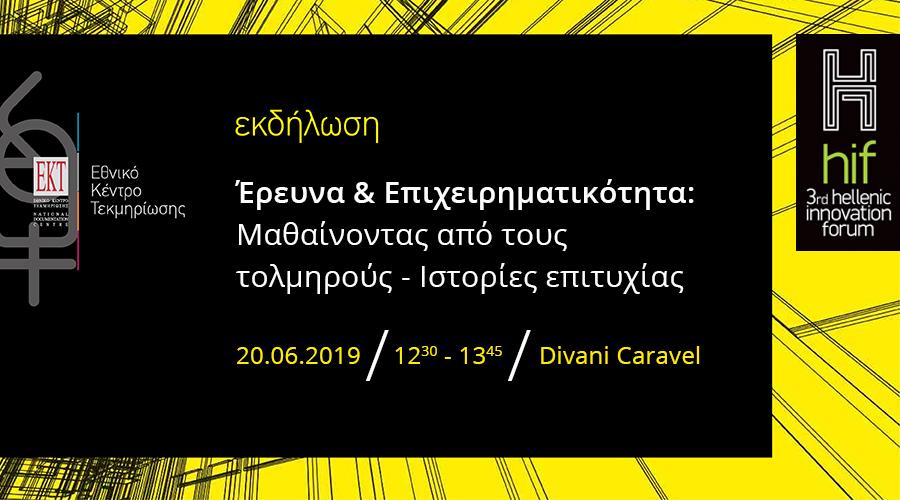 Το Εθνικό Κέντρο Τεκμηρίωσης (ΕΚΤ) διοργανώνει εκδήλωση με τίτλο «Έρευνα και επιχειρηματικότητα: Μαθαίνοντας από τους τολμηρούς – Ιστορίες επιτυχίας», στο πλαίσιο του 3rd Hellenic Innovation Forum (20 Ιουνίου 2019, Αθήνα, ξενοδοχείο Divani Caravel). Η εκδήλωση θα πραγματοποιηθεί την Πέμπτη 20 Ιουνίου 2019 (12:30-13.45) στην αίθουσα «Βεργίνα».