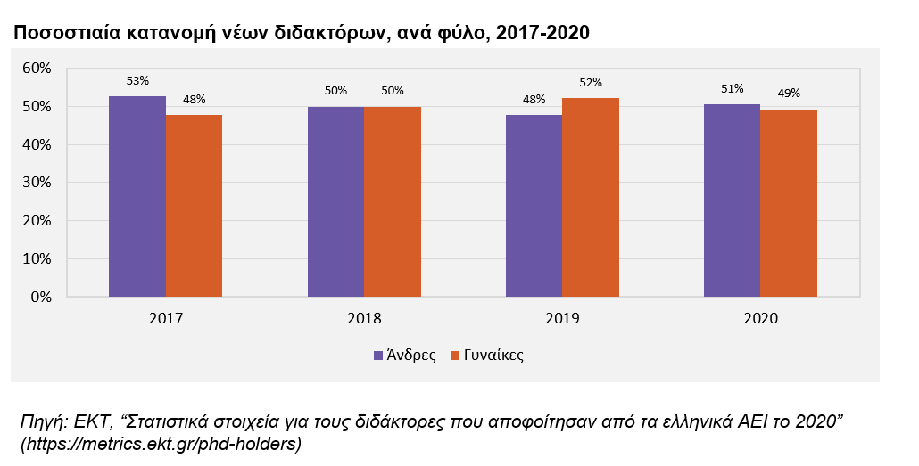 Όσον αφορά τα διαχρονικά στοιχεία για την περίοδο 2017-2020, αξίζει να σημειωθεί ότι υψηλότερα ποσοστά για τους άνδρες σημειώνονται τα έτη 2017 και 2020, απόλυτη ισορροπία μεταξύ ανδρών και γυναικών το 2018, ενώ υψηλότερα ποσοστά για τις γυναίκες νέες διδάκτορες, το 2019.