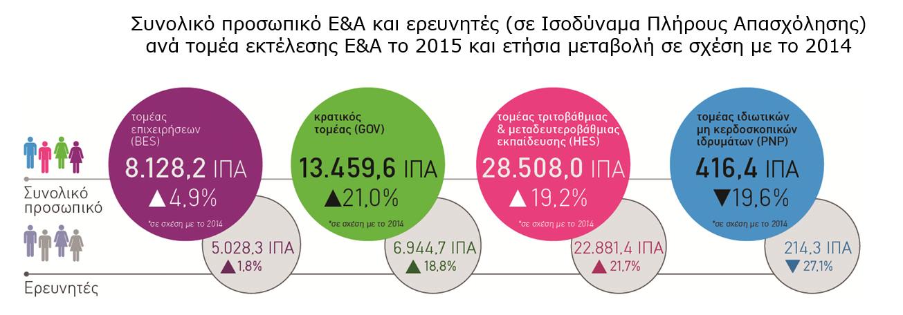 Η σημαντική αύξηση των δαπανών Ε&Α έχει ως αποτέλεσμα την επίσης σημαντική αύξηση στην απασχόληση σε δραστηριότητες Ε&Α. Το 2015, ο αριθμός των Ισοδυνάμων Πλήρους Απασχόλησης (ΙΠΑ), που αποδίδουν "θέσεις" πλήρους απασχόλησης, καθώς ένα ΙΠΑ είναι ισοδύναμο με έναν εργαζόμενο πλήρους απασχόλησης, αυξάνεται κατά περίπου 17% σε σχέση με το 2014, τόσο για το συνολικό προσωπικό σε Ε&Α όσο και για τους ερευνητές. Το συνολικό προσωπικό σε Ε&Α το 2015 ανέρχεται σε 50.512,2 ΙΠΑ και οι ερευνητές σε 35.068,7 ΙΠΑ. Η μεγαλύτερη αύξηση καταγράφεται στον τομέα της τριτοβάθμιας και μεταδευτεροβάθμιας εκπαίδευσης.