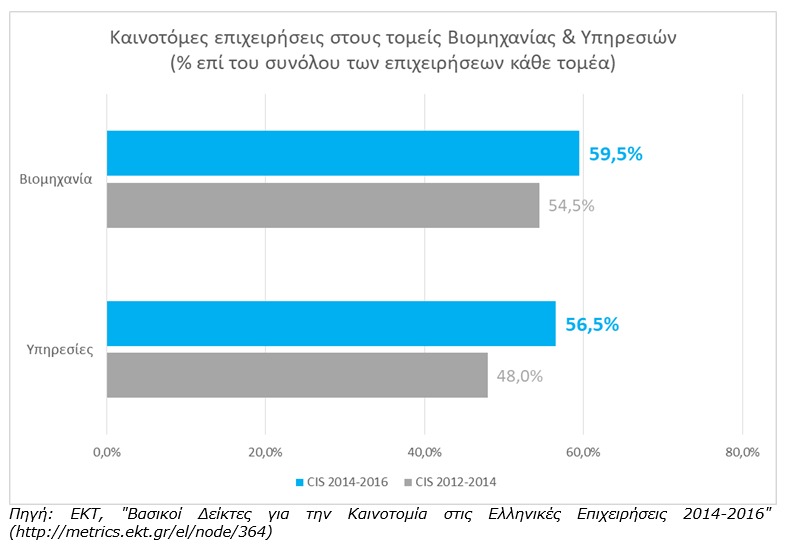 Με βάση τα στοιχεία για τις ελληνικές επιχειρήσεις την περίοδο 2014-2016, στον τομέα της Βιομηχανίας καινοτομεί το 59,5% των επιχειρήσεων του τομέα, και στον τομέα των Υπηρεσιών καινοτομεί το 56,5% των επιχειρήσεων του τομέα.
