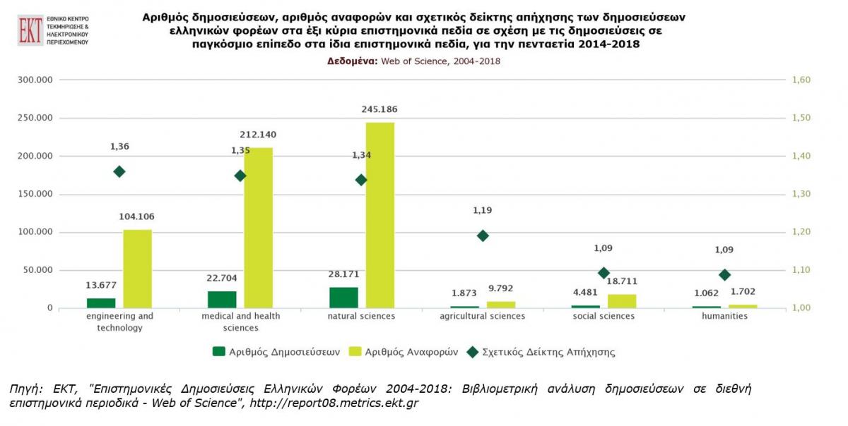 Το 2018 καταγράφονται 11.606 επιστημονικές δημοσιεύσεις ελληνικών φορέων στα διεθνή επιστημονικά περιοδικά. Ο αριθμός των αναφορών στις δημοσιεύσεις των ελληνικών φορέων συνεχίζει να διατηρεί την αυξητική τάση όλων των προηγούμενων ετών, και την πενταετία 2014-2018 φθάνει τις 454.084 αναφορές. Σημειώνεται ότι αυτός ο αριθμός συνιστά ένα νέο ιστορικά υψηλό επίπεδο.