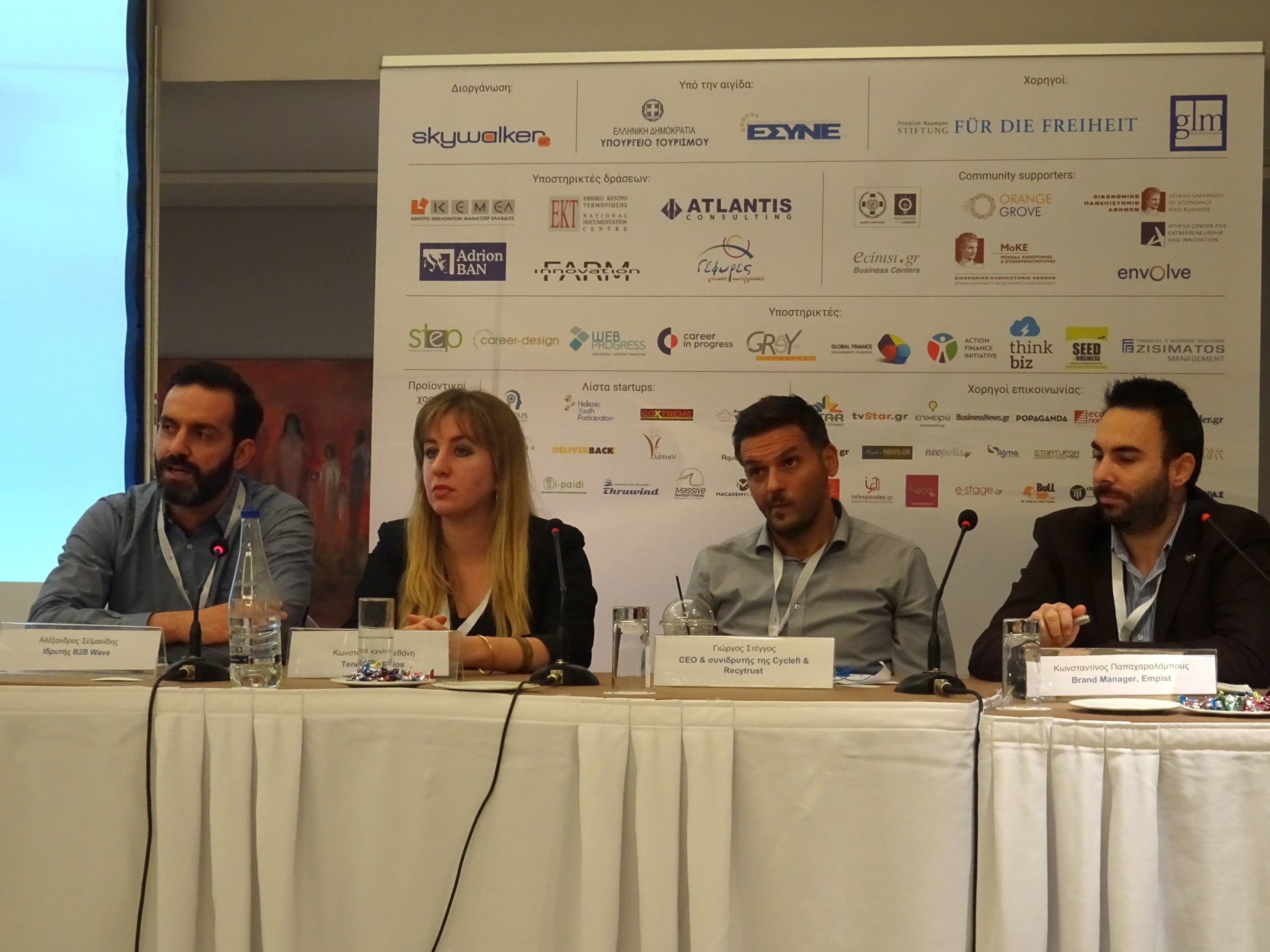 Giorgos Steggos, CEO & co-founder of Cyclefi & Recytrust was next to share his experience. Cyclefi is a Greek Startup which has developed a reliable method of recycling which creates incentives for citizens to increase their levels of recycling on a household level and is preparing to enter the Greek and international market in partnership with a large consumer products company. Having recently received the Smart City award in the Startup Europe Awards, he referred to the importance of a new company to participate in international and national fora and exploiting every development opportunity.