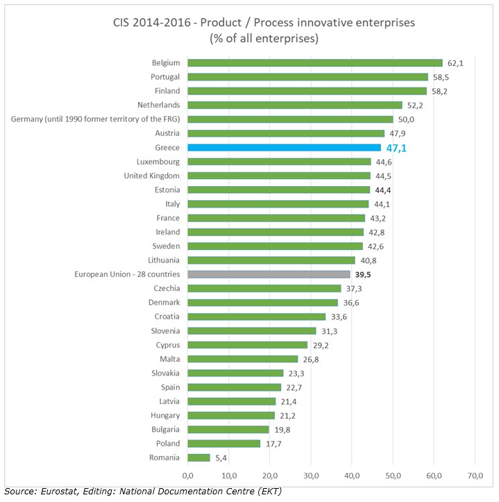Particularly important is the position of Greece in product and/or process innovation, with a percentage of 47.1%, which ranks it 7th among EU-28 member states far above the European average (39.5%). Leading European countries in product and / or process innovation are Belgium with 62.1%, followed by Portugal with 58.5% and Finland with 58.2%. In 10th place is Estonia with 44.4% in product and/or process innovation.