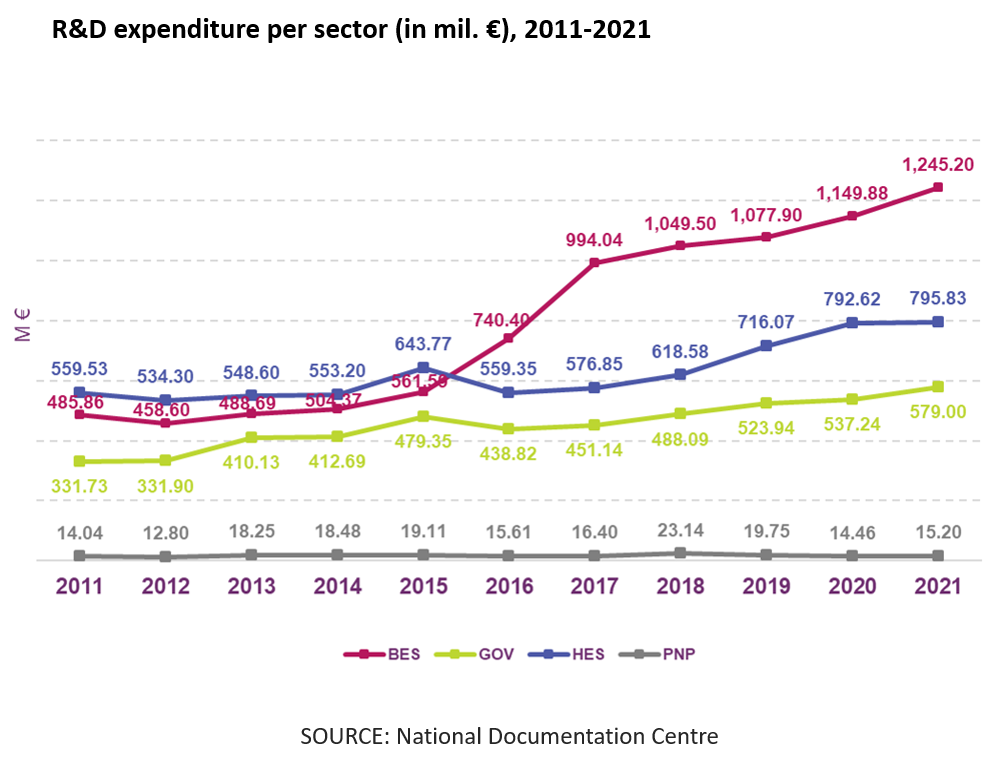 In the higher education sector, R&D expenditure was 795.83 million euro (0.44% of GDP) and was at the same level as in 2020, showing an increase of 0.4%. In the area of private non-profit institutions, R&D expenditure of 15.20 million euro was recorded (0.01% of GDP).