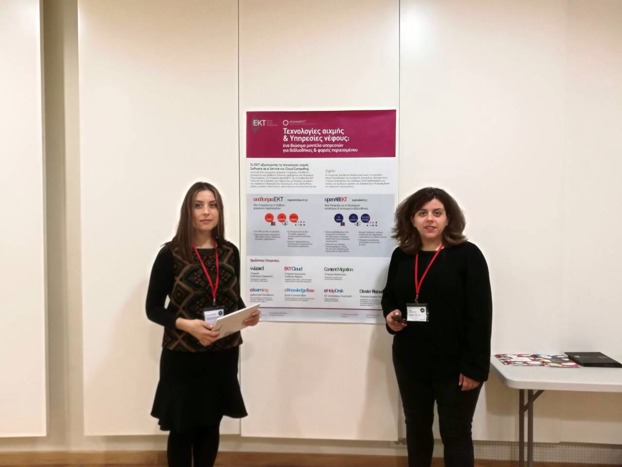 - τις υπηρεσίες νέφους openABEKT & Αποθετήρια ΕΚΤ, με το poster «Τεχνολογίες αιχμής και υπηρεσίες νέφους: ένα βιώσιμο μοντέλο υπηρεσιών για βιβλιοθήκες & φορείς περιεχομένου» (Κατερίνα Μπάρτζη, Αλεξία Παναγοπούλου, Έλενα Λαγούδη, Νίκος Βασιλογαμβράκης, Αγάθη Παπανότη, Πηνελόπη Καραγιάννη, Παρασκευάς Καμάτσος, Ελένη Αγγελίδη, Δέσποινα Χαρδούβελη, Γιώργος Σταύρου, Κώστας Σταμάτης, Παναγιώτης Κονταξής, Εύη Σαχίνη).