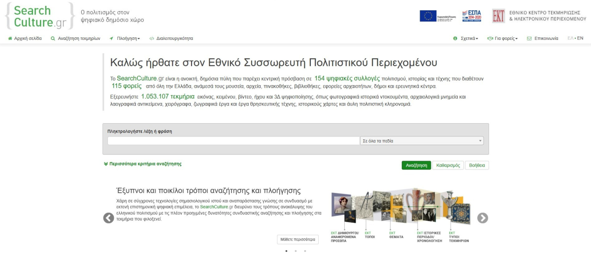 - Στη συνέχεια, από το 2020 και μέχρι το 2023, το SearchCulture.gr αναβαθμίστηκε και επεκτάθηκε στο πλαίσιο του έργου "Εθνικό Πληροφοριακό Σύστημα Έρευνας και Τεχνολογίας: Υποδομή Συσσώρευσης, Τεκμηρίωσης και Διάθεσης Ψηφιακού Περιεχομένου με διασφάλιση διαλειτουργικότητας, μακροχρόνιας διατήρησης και ανοικτής πρόσβασης" (Επιχειρησιακό Πρόγραμμα "Μεταρρύθμιση Δημοσίου τομέα", ΕΣΠΑ).
