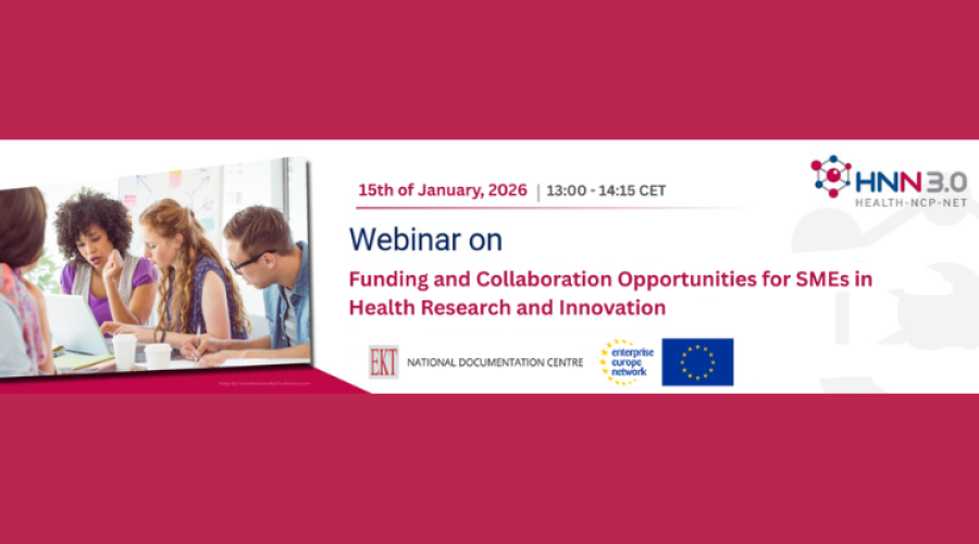 Το Εθνικό Κέντρο Τεκμηρίωσης & Ηλεκτρονικού Περιεχομένου (ΕΚΤ), βασικό μέλος του δικτύου των Εθνικών Σημείων Επαφής για την Υγεία στον Ορίζοντα Ευρώπη HNN3.0, Εθνικό Σημείο Επαφής για την Υγεία και την Αποστολή για τον Καρκίνο στον Ορίζοντα Ευρώπη και συντονιστής του Enterprise Europe Network Hellas, διοργανώνει διαδικτυακή εκδήλωση με τίτλο "Funding and Collaboration Opportunities for SMEs in Health Research and Innovation" την Τρίτη 15 Ιανουαρίου 2026 (ώρα Ελλάδας 14.00-15.15).